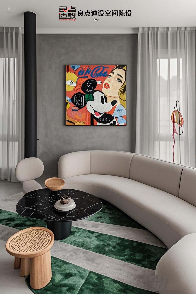 再來說說搭配的弧形沙發。它就像一個溫柔的懷抱,給人滿滿的安全感。柔和的線條和硬朗的墻面、柱子形成了鮮明的對比,在視覺上產生了強烈的沖擊力。坐上去,柔軟的質感包裹著身體,讓人瞬間放松下來。而且弧形的設計還增加了空間的流動感,讓客廳看起來更加寬敞。想象一下,在忙碌了一天之后,回到家躺在這舒適的沙發上,看著墻上的畫,所有的疲憊都煙消云散了。