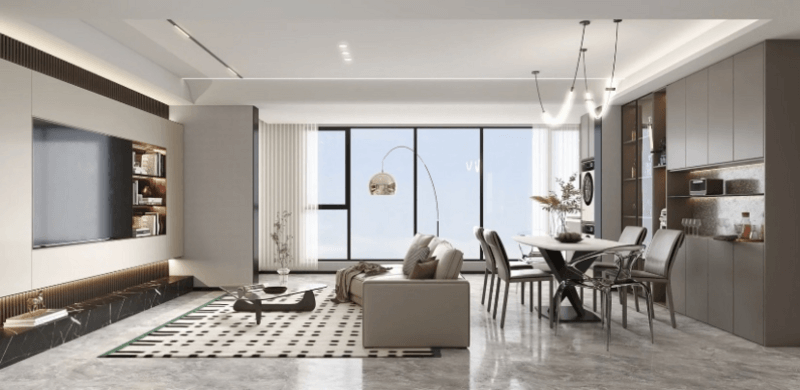 2、客餐廳一體式,選擇三人位沙發搭配邊椅,更加靈活;以沙發作為軟隔斷,餐廳根據家庭需求選擇多人位;